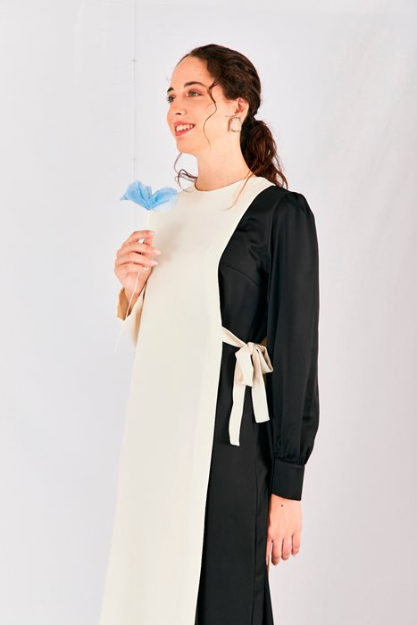 שמלה בעיצוב ייחודי חצי שחור וחצי לבן, מה שיוצר מראה חגיגי במיוחד!