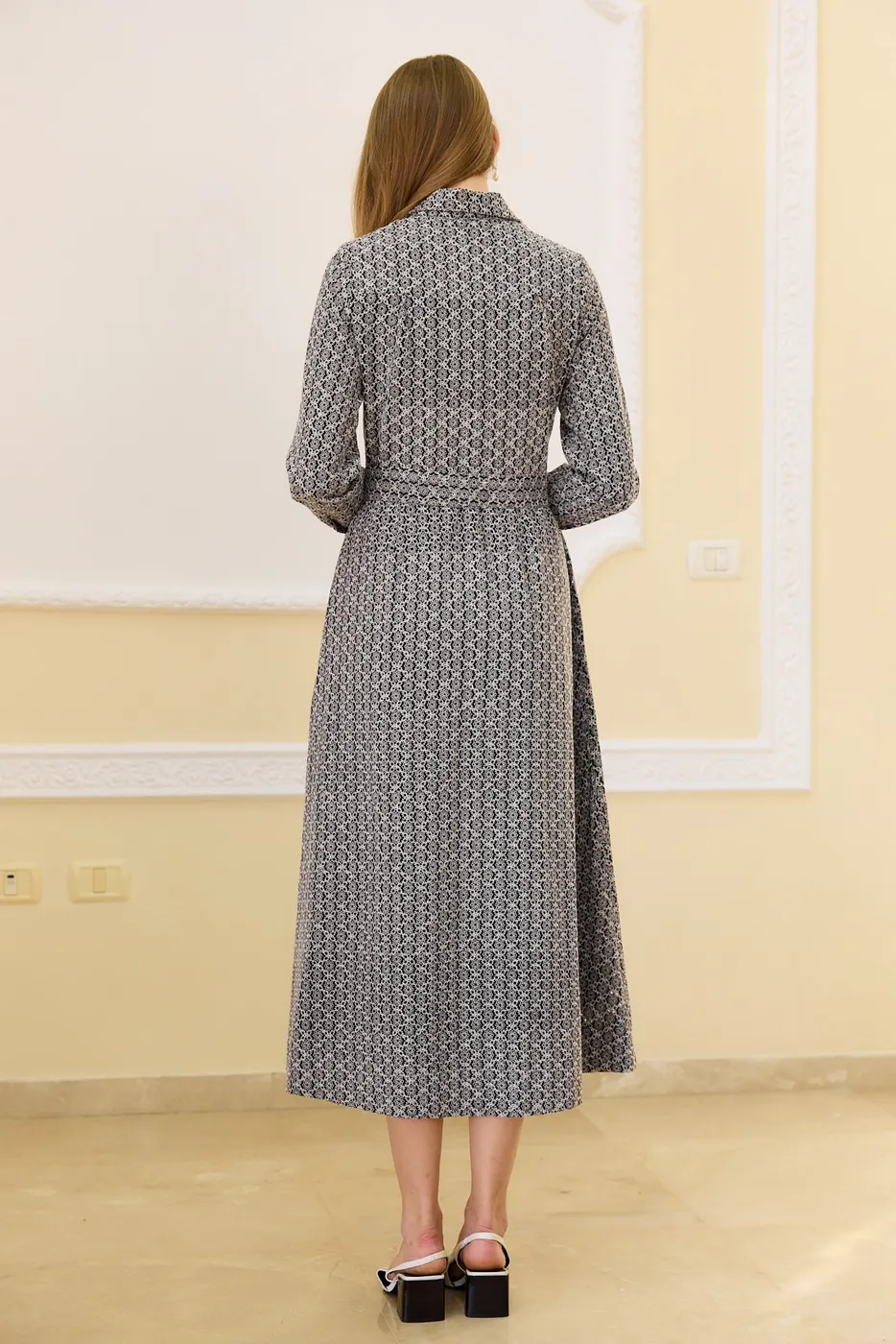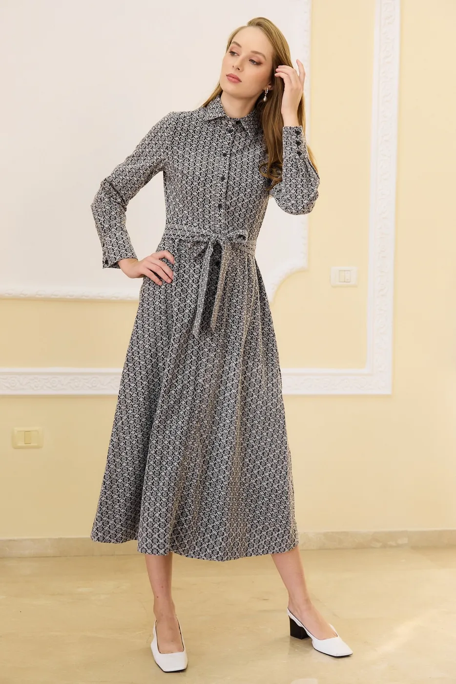 שמלה בגזרה קלאסית ומחמיאה עם בד ריקמה חגיגי ואופנתי