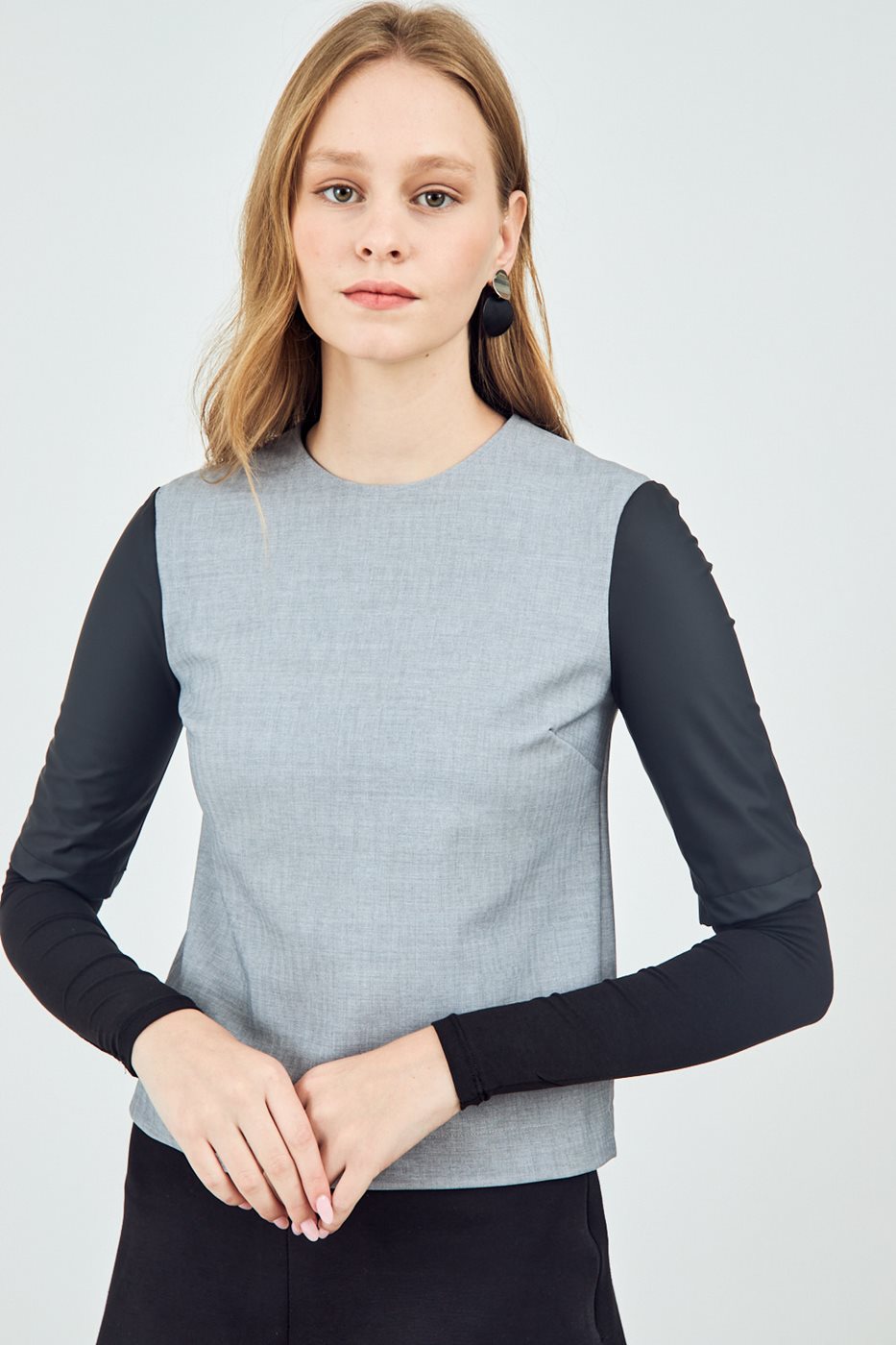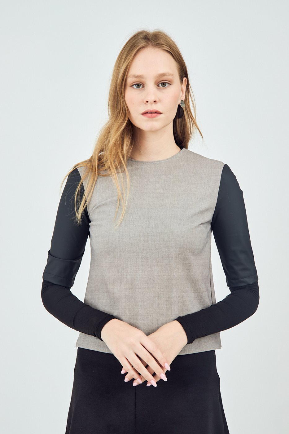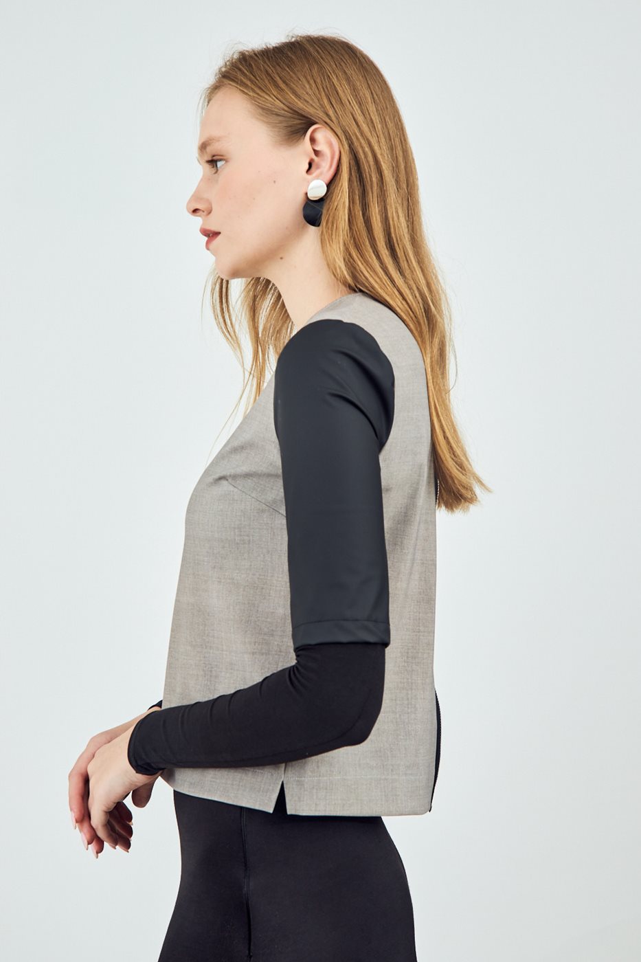עם שרוולי דמוי עור בצבע שחור מט מושלם, ורוכסן כסוף מאחורה לתוספת חגיגיות.