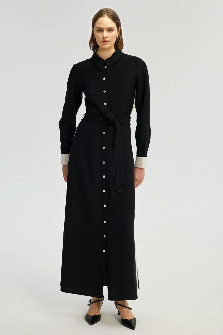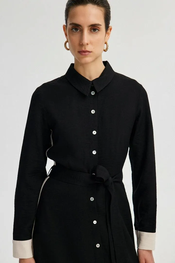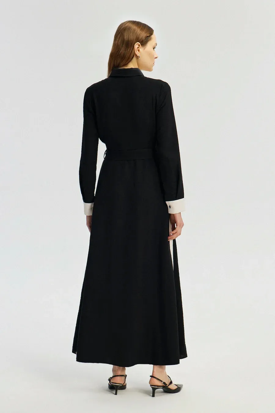 שמלת צווארון קלאסית בצבע שחור, המשולבת בפסים בצבע בז' עדינים, ליצירת מראה נקי ואלגנטי.
