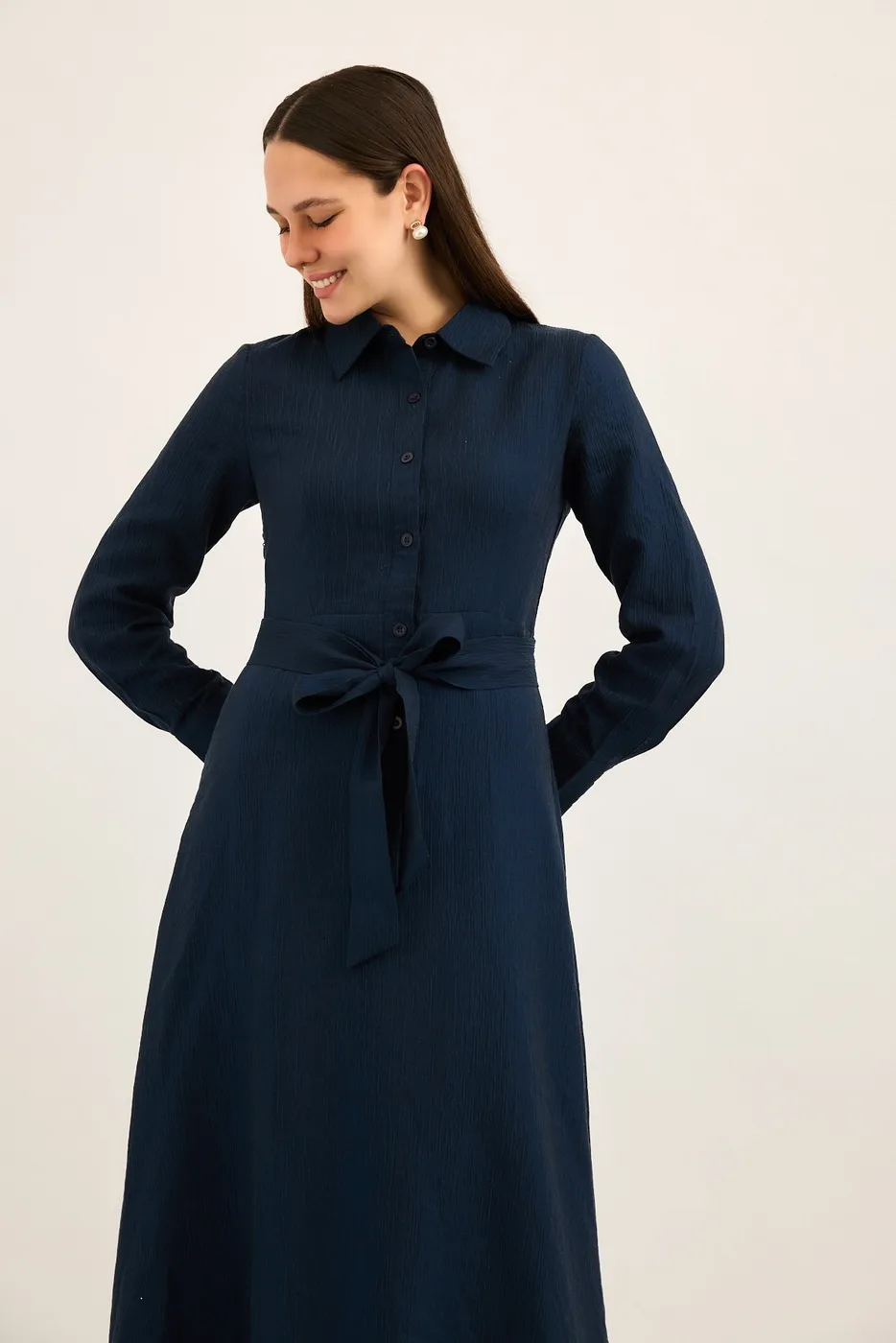 הגזרה האלגנטית מחמיאה לכל מבנה גוף, והחגורה המגיעה עם השמלה מאפשרת להדגיש את המותן.