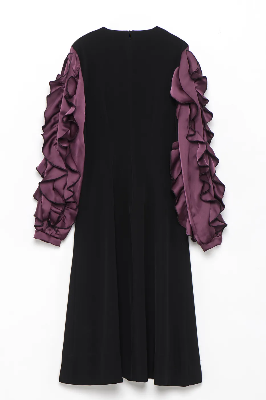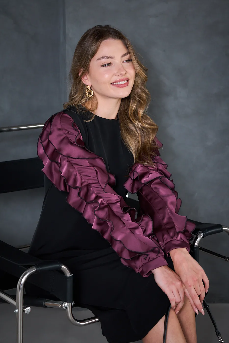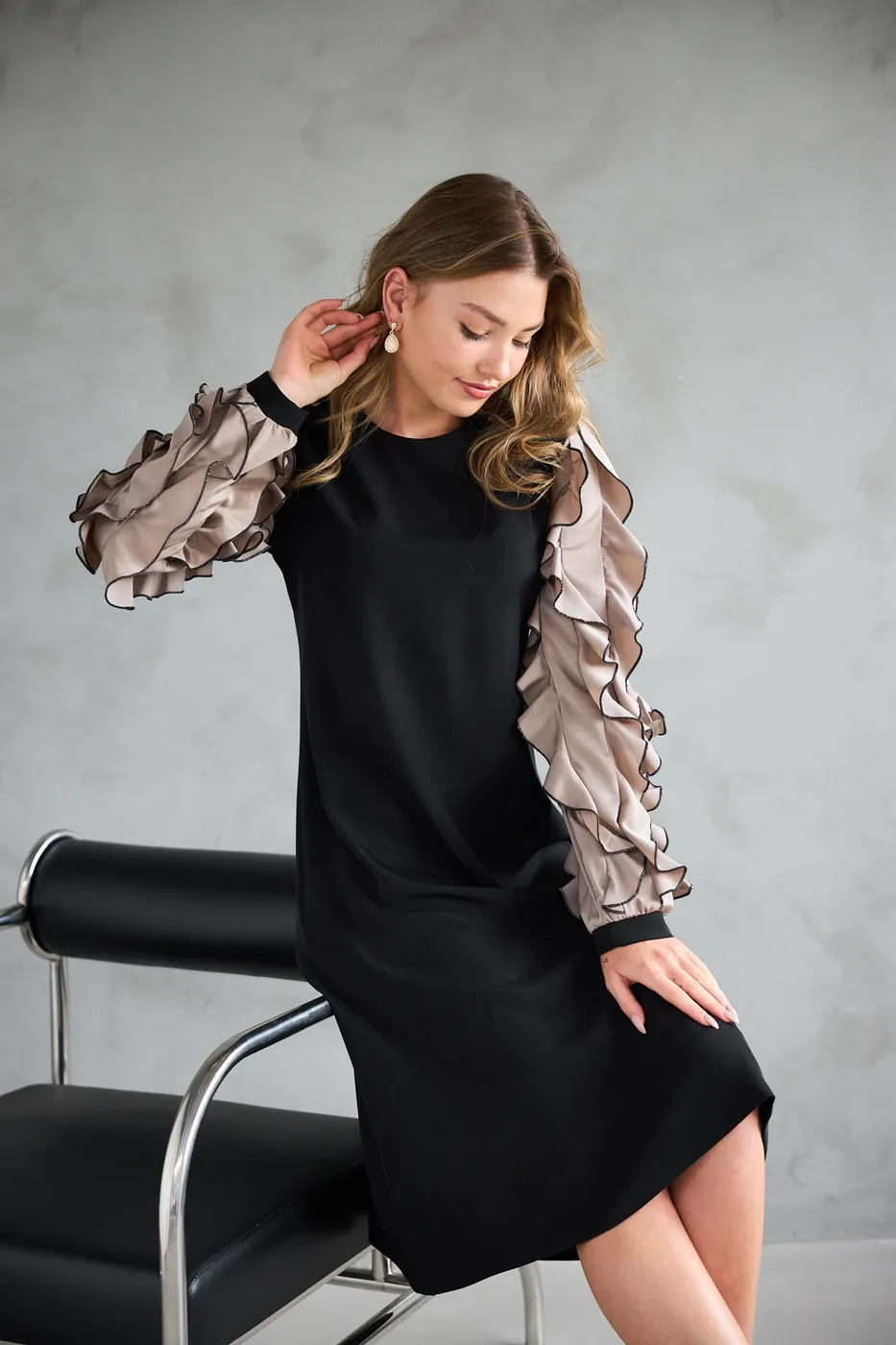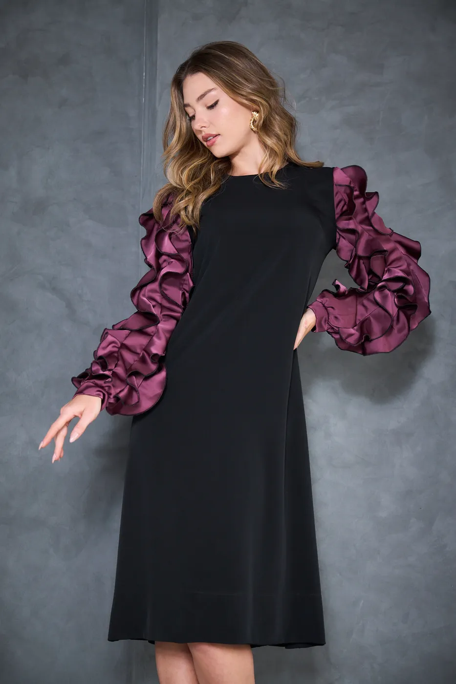 שמלה מרשימה וטרנדית במיוחד, התלתלים הנשפכים בשרוולים מעניקים מראה חגיגי ביותר.
