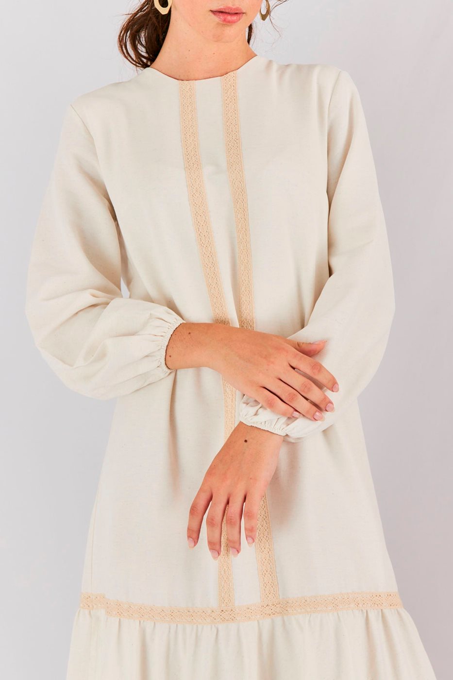 בגזרה נקייה ומשוחררת, והפסים תחרה לאורך השמלה נותנים מראה מרזה.