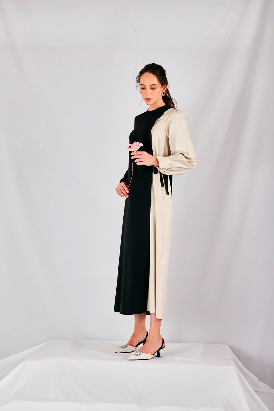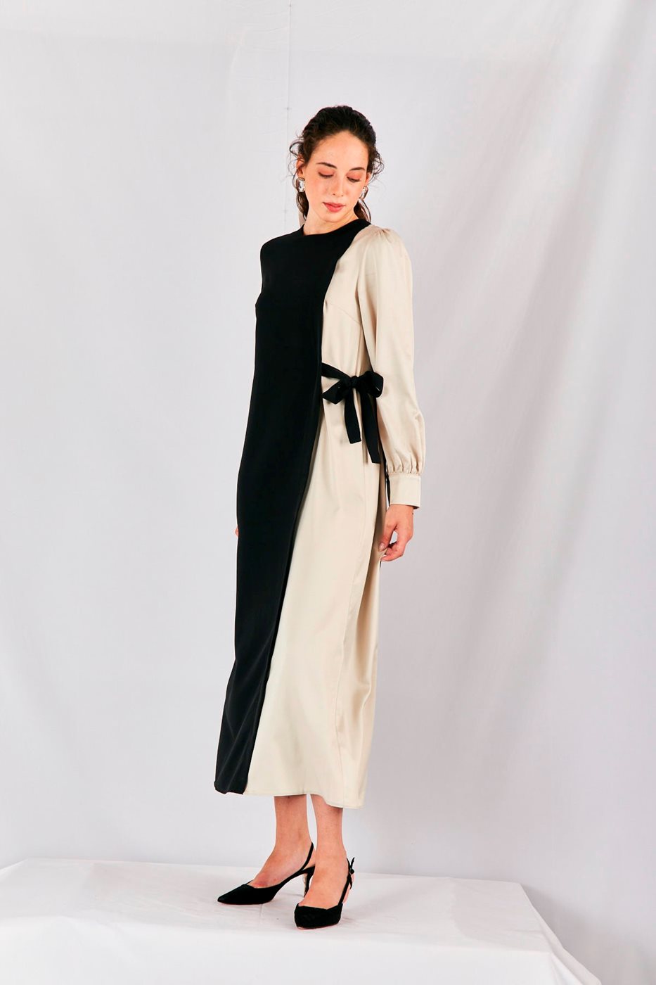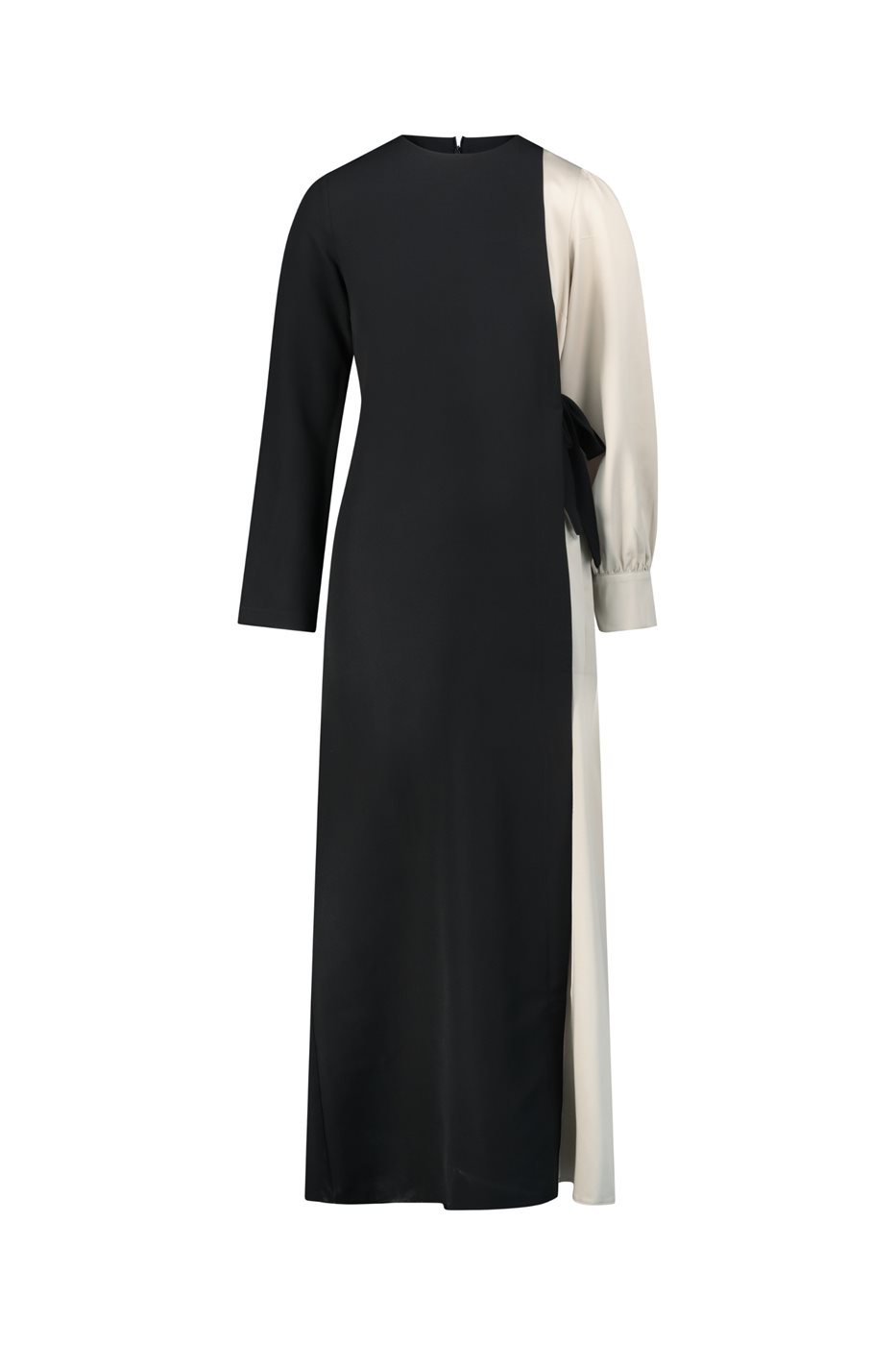 שמלה בעיצוב ייחודי חצי שחור וחצי לבן, מה שיוצר מראה חגיגי במיוחד!