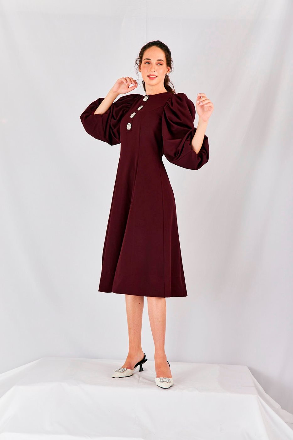 השרוולים התפוחים יוצרים מראה מיוחד, בעוד סרט היהלומים במרכז השמלה מוסיף חגיגיות יוקרתית. בד השמלה גמיש ונמתח היוצר נוחות מקסימלית, ומחמיאה לכל סוגי הגוף.