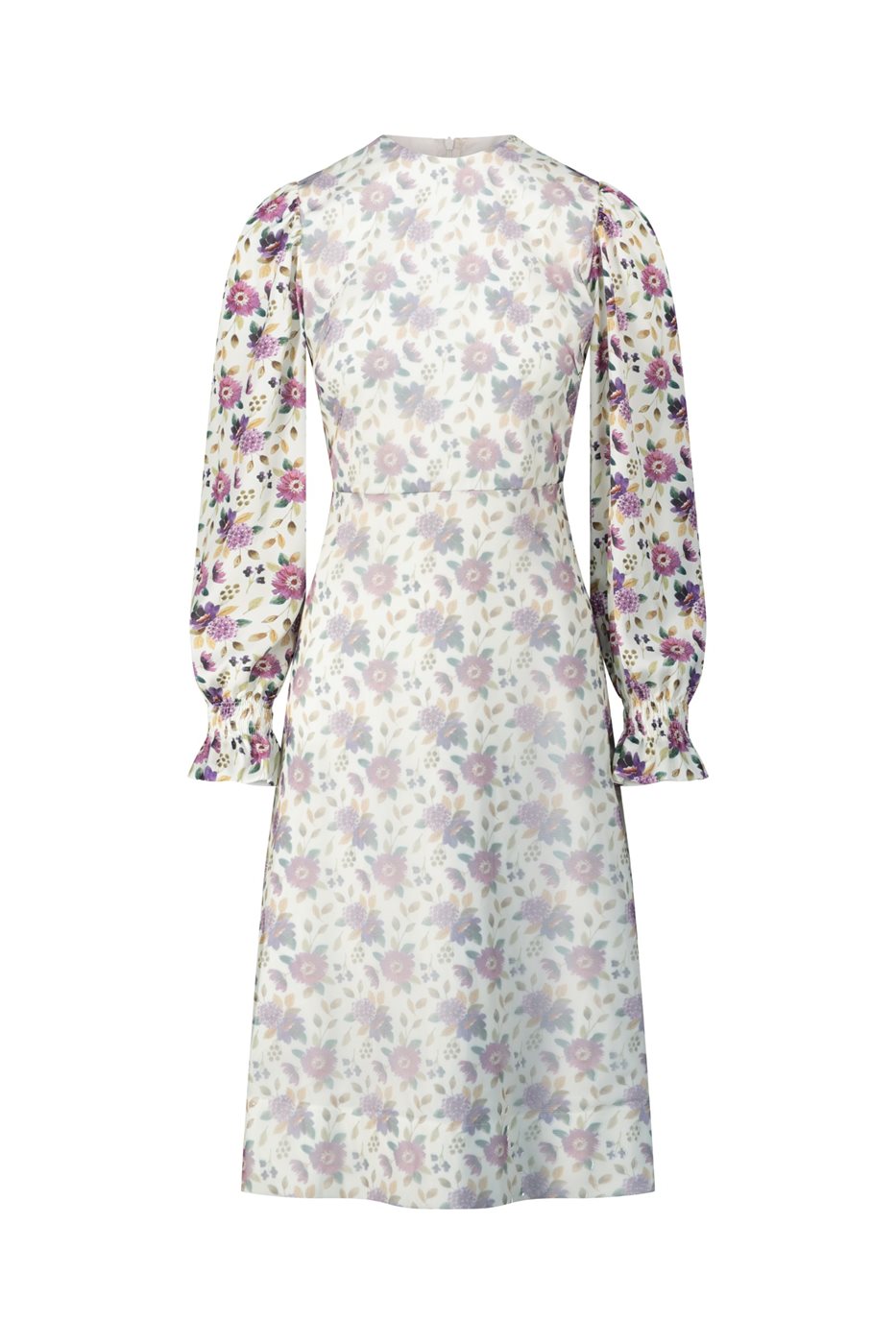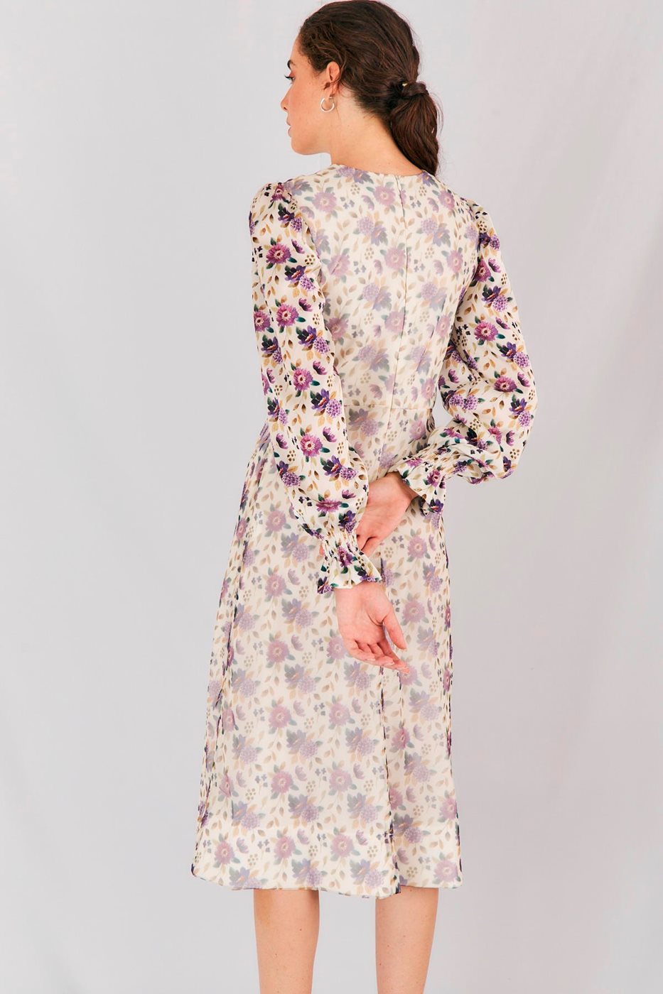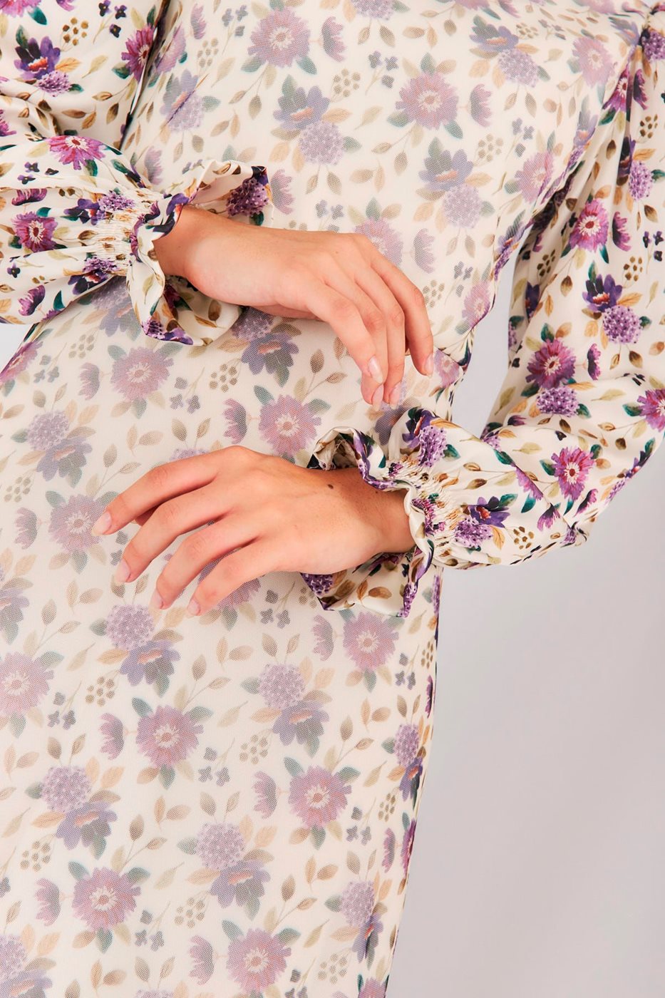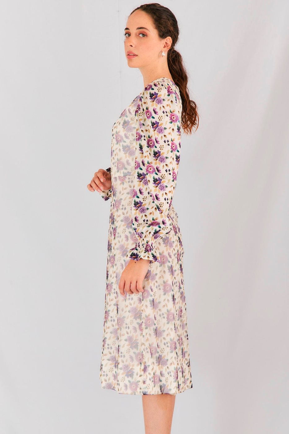 שמלת טול בשילוב סאטן מודפסת פרחים שמנת וסגול