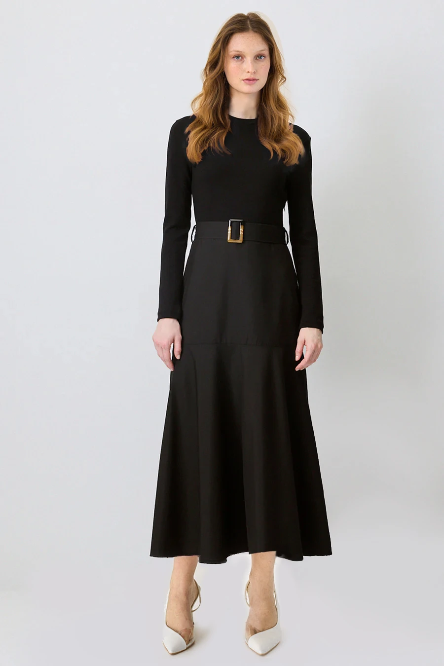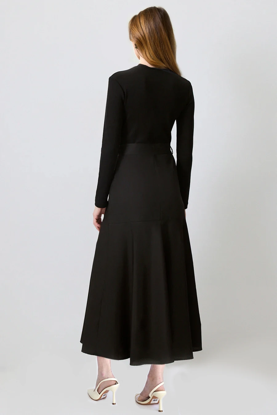 הטופ מבד נמתח, והחצאית בגזרה מתרחבת ותיפורים מדוייקים.