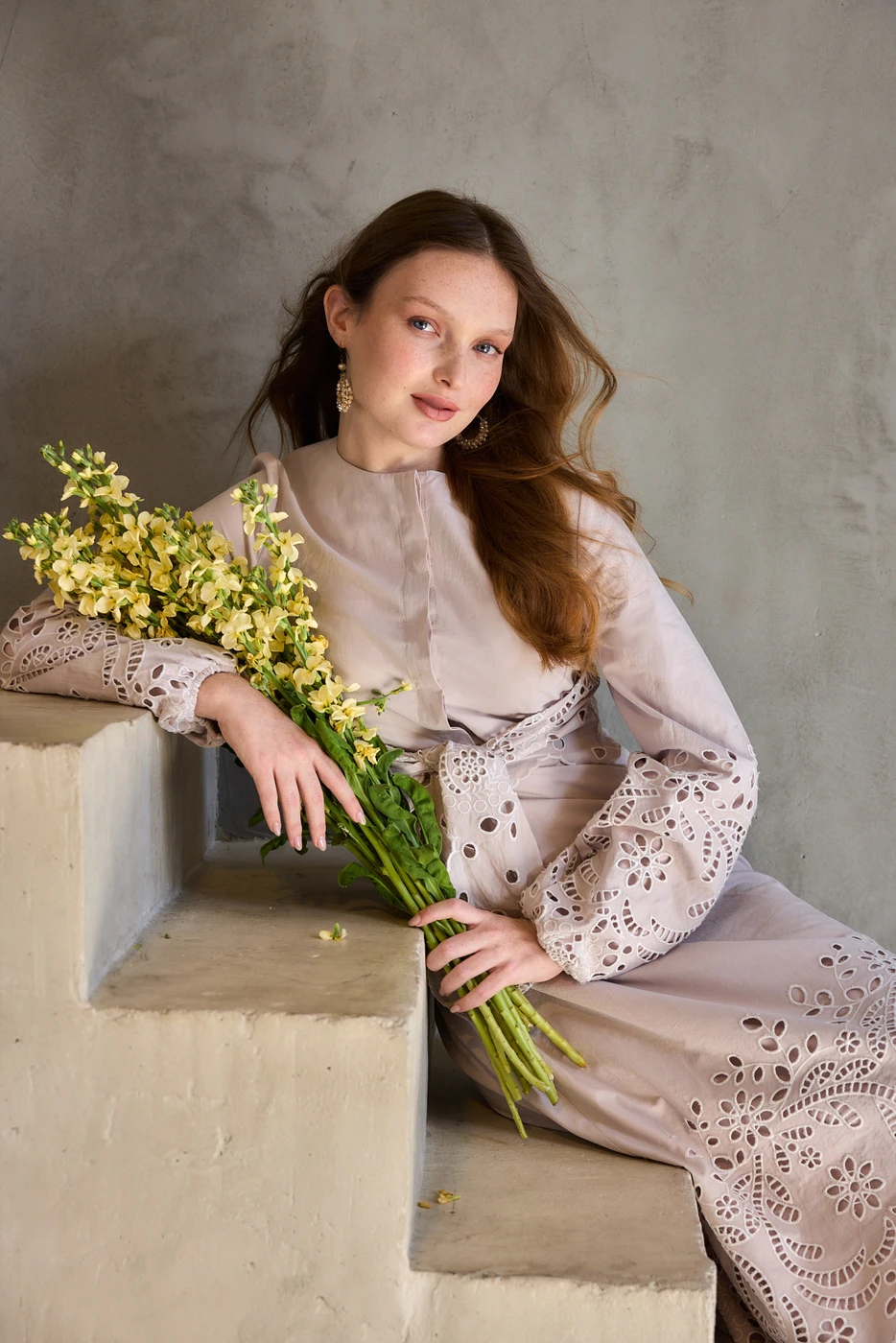 שמלת כותנה המעוטרת בתחרה עדינה.