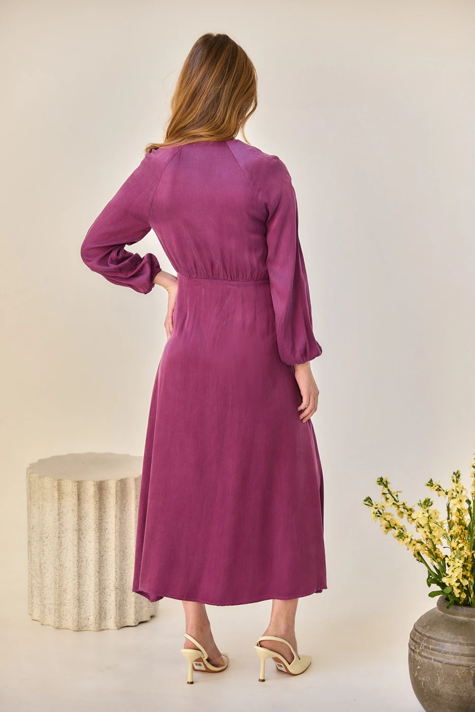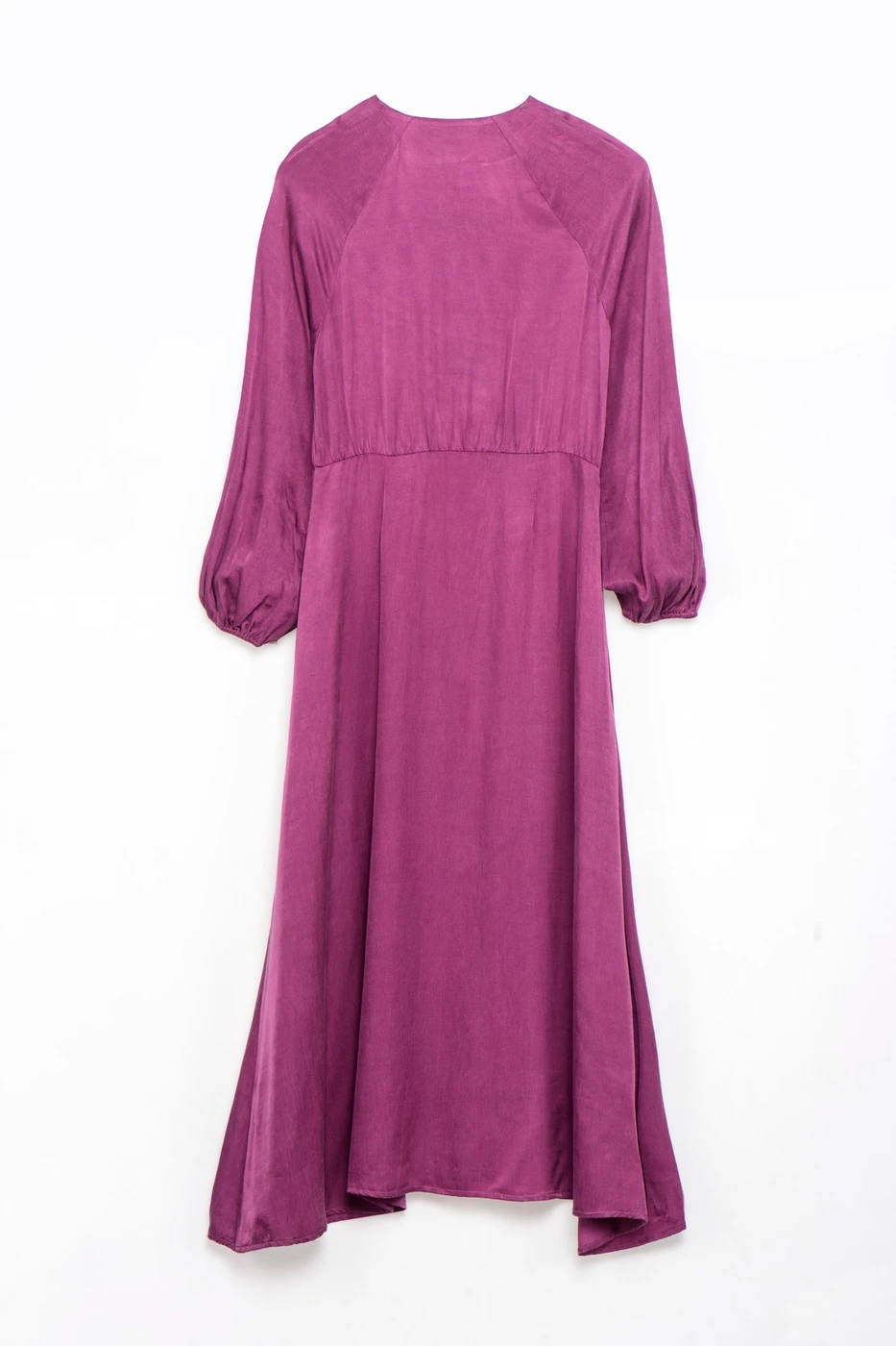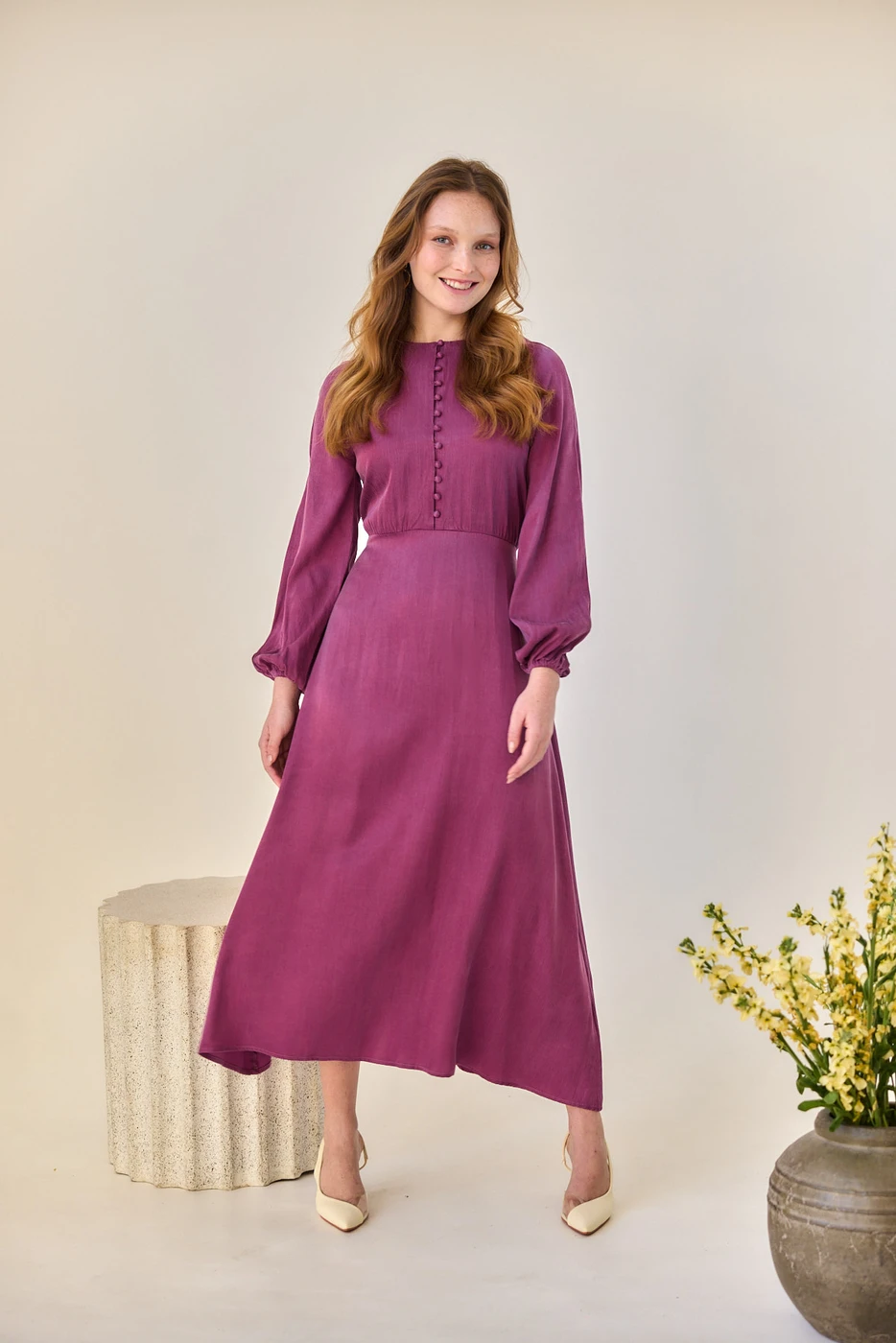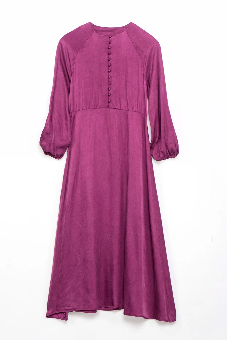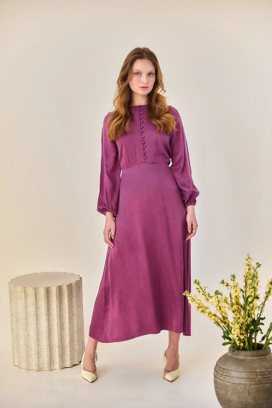 שמלת מבד דמוי זמש עשויה מבד רך ונעים למגע, עם כפתורים להשלמת ההופעה.