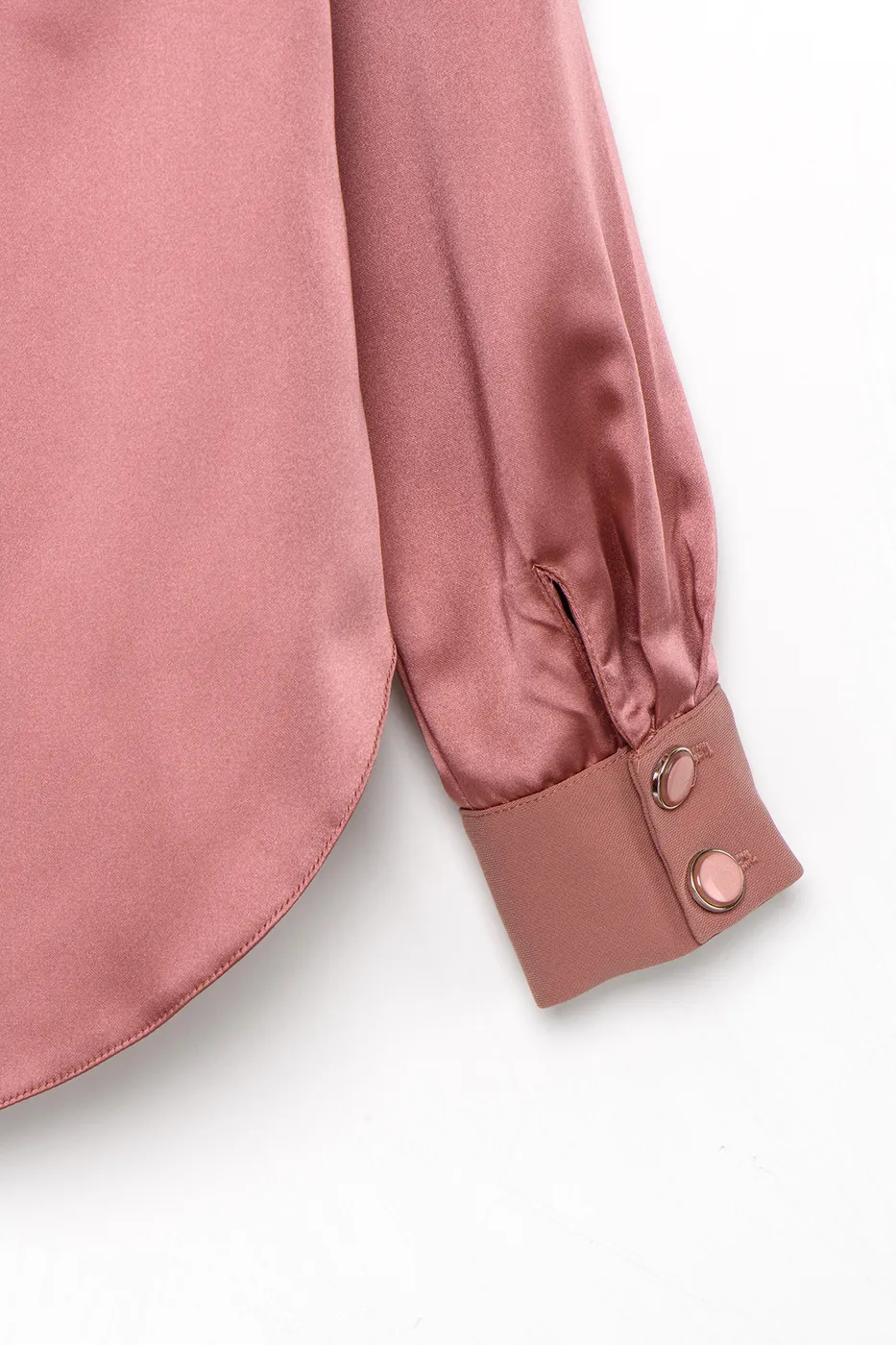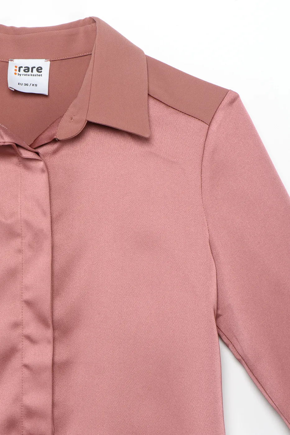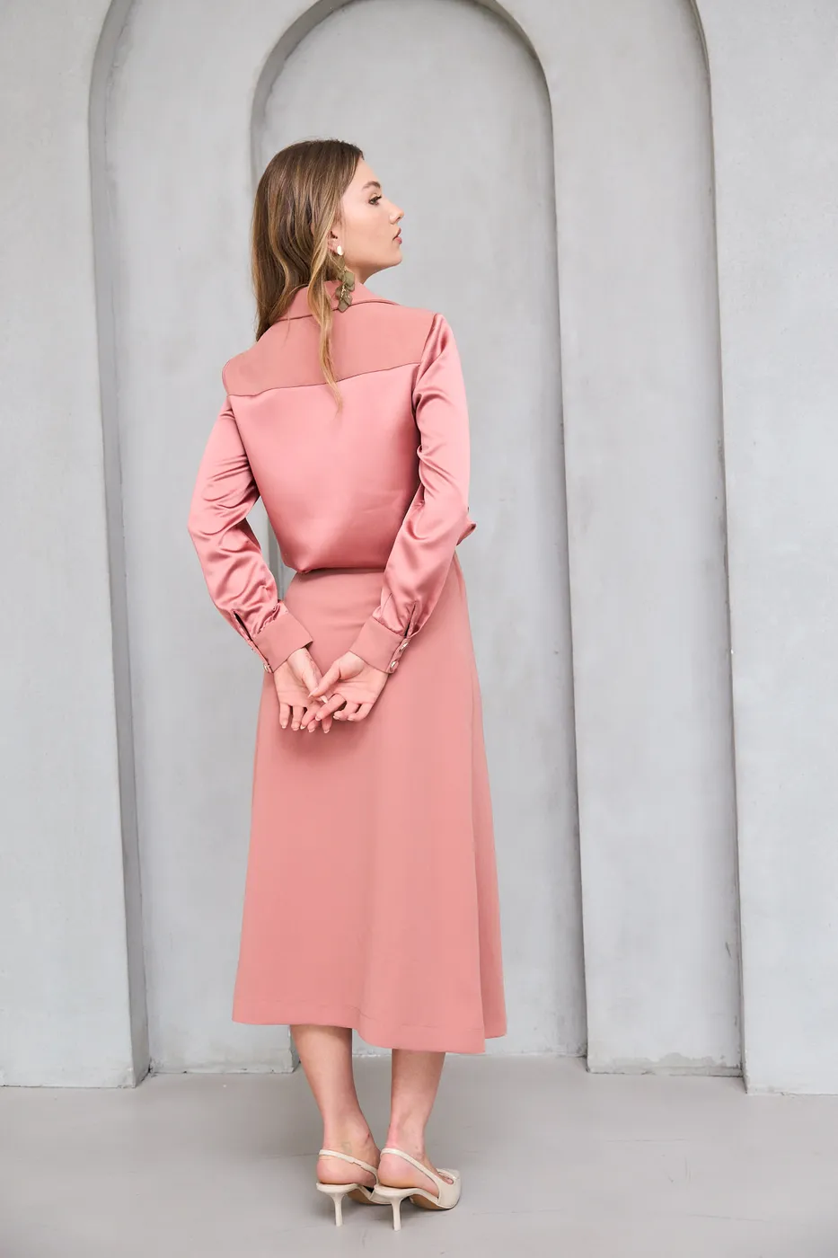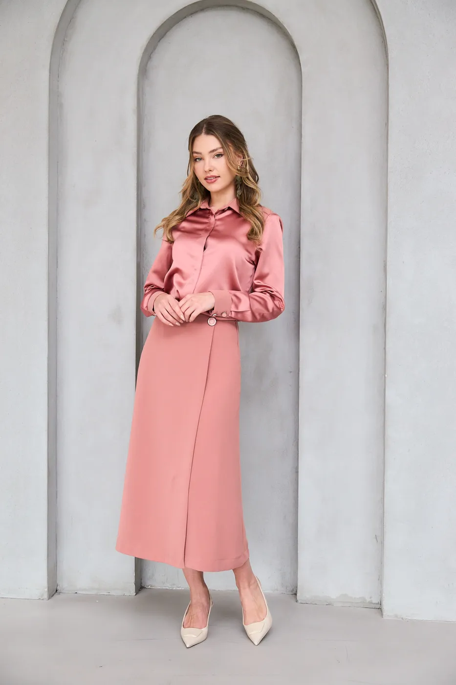 החולצה עשויה מבד סאטן, המעניק לה מראה מבריק ואלגנטי. והחצאית, עשויה מבד מט איכותי, במראה קלאסי ונוח.